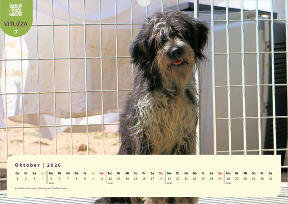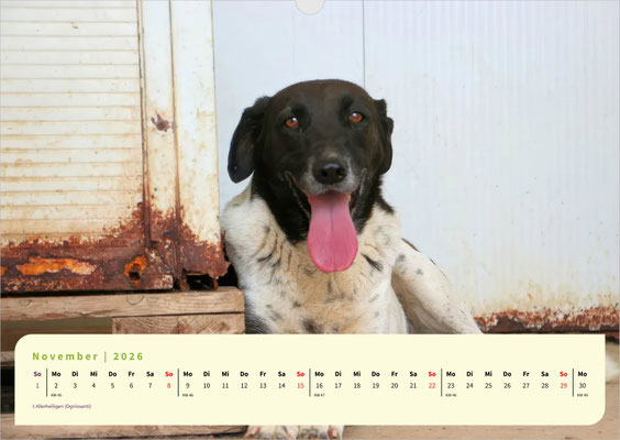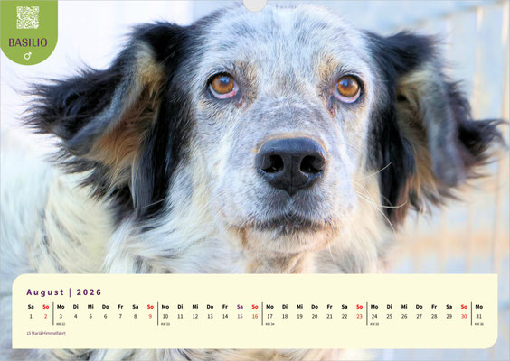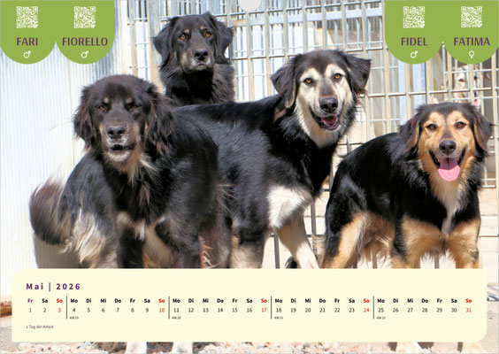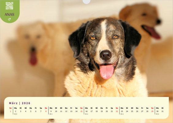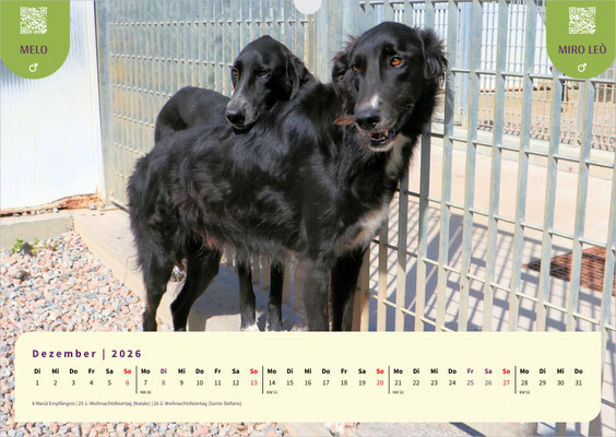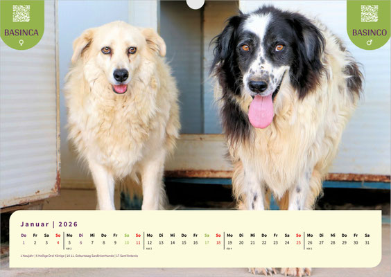 Dieses Mal ist unser A3-Monatskalender jenen treuen Seelen gewidmet, die schon besonders lange auf ihre zweite Chance, auf ein für immer Zuhause, warten. Lassen Sie sich Monat für Monat von den bezaubernden Gesichtern unserer Langzeit-Schützlinge begleiten. Darunter sind ANAS, Fonessinas Kinder FARI, FATIMA, FIDEL und FIORELLO, GESUS, MARISA mit ihrem Bruder MERLOT, die Geschwister MELO und MIRO LEO, sowie die Hunde vom Arca Planet: BASEL, BASILIO, BASINCA und BASINCO. Außerdem erwarten Sie die schon sehr lange wartende SANTA MARIA, VANESSA und last but not least unsere hübsche VITUZZA.